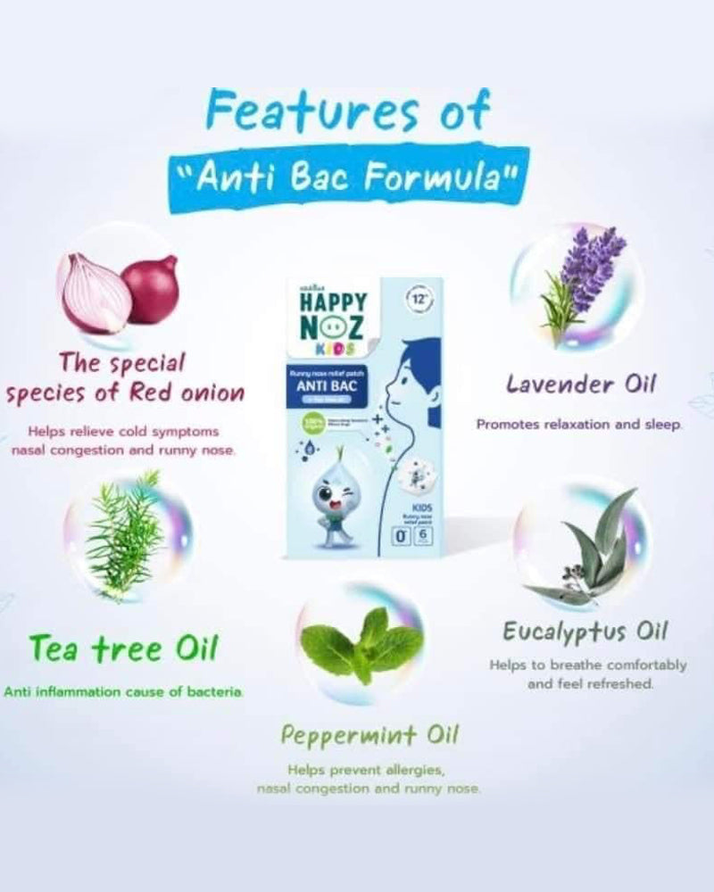 Original - Relieve colds, blocked nose and runny nose. Anti Virus - Balance the immune system and virus protection. Anti Bac - Reduce the Growth of Bacteria. Anti Cough - Clear Mucus from the respiratory Tract, reduces coughing. Detox PM2.5 - Contains anti-oxidants that help reduce throat and nose irritation from PM 2.5. 100% Organic Ingredients and Certified by USDA Balance the immune system and virus protection for kids. Easy to use stick on patch/sticker 6 individual pack per box. Made in Thailand.