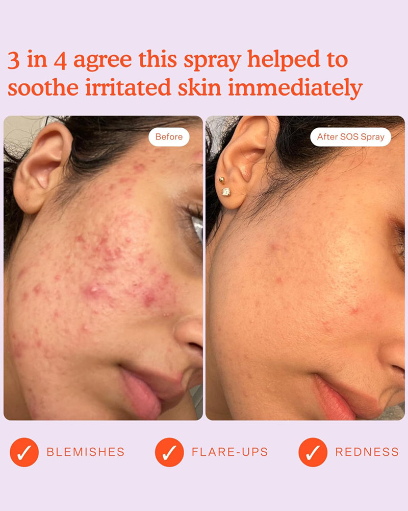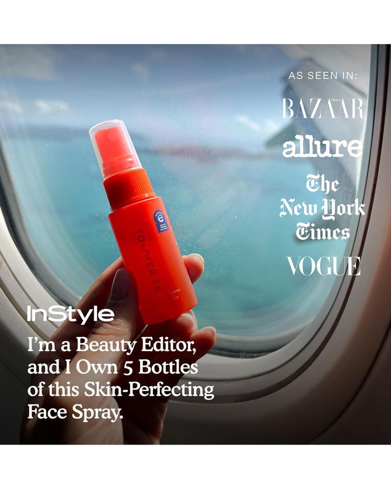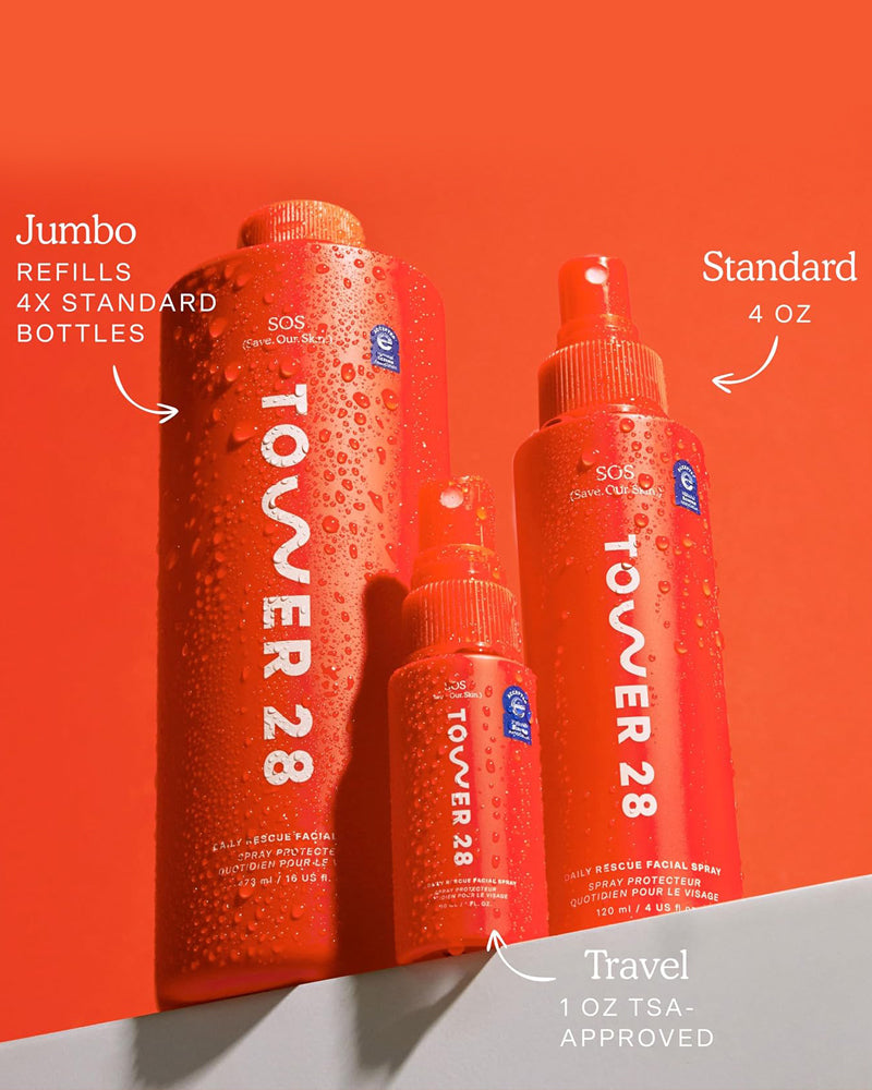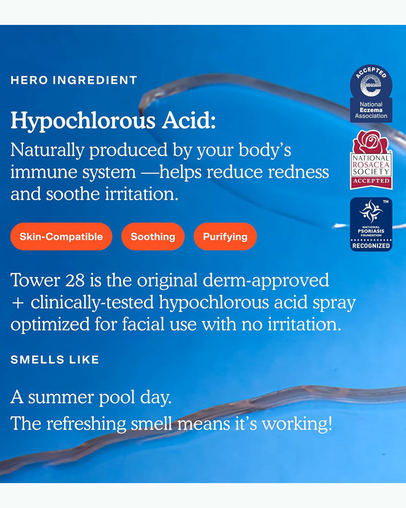 The Tower 28 SOS Rescue Spray is a soothing, purifying and renewing facial toner spray for redness and angry, irritated skin. Powered by hypochlorous acid, this daily toner works as a travel-sized face spray that helps calm your skin, support the skin barrier, and keep flare-ups at bay for clean and clear skin. The SOS facial spray is safe for all skin types. The Tower 28 SOS Facial Spray is pH balanced, alcohol-free, fragrance-free, oil-free, vegan, and cruelty-free. Use AM/PM on clean skin in place of toner to help redness and irritation relief. To layer with active ingredients (like retinol, vitamin C), apply the SOS spray first and let it dry fully before applying actives. Pair with our SOS Intensive Rescue Serum for a double hit of hypochlorous acid and the best results—your skin will love it!